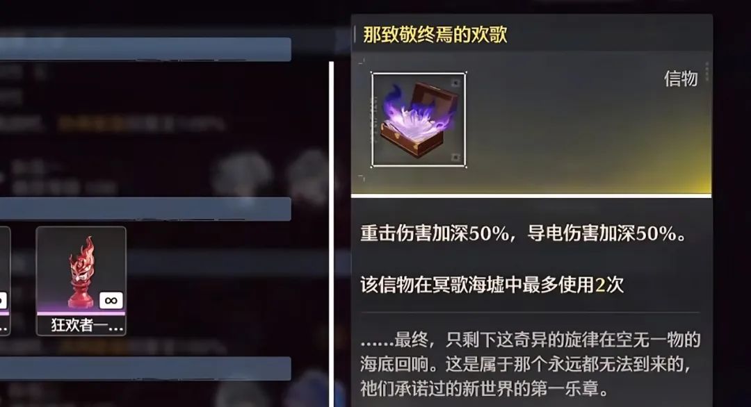 更让玩家感到困惑的是,另一个信物“致敬终焉的欢歌”,其特效加成集中在导电以及重击伤害方面。明眼之人一眼便可看出,这是在为还未上线的奥古斯塔铺垫道路。这种“提前将角色锁定”的设计让许多使用老角色的玩家觉得内心不畅快。