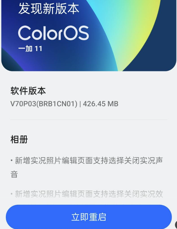 一加11 刚收到V70P03大礼包!426MB不算大,但干货满满——实况照片能静音了(社恐福音!),便签/文件管理/车载功能全优化,日常使用更顺手。