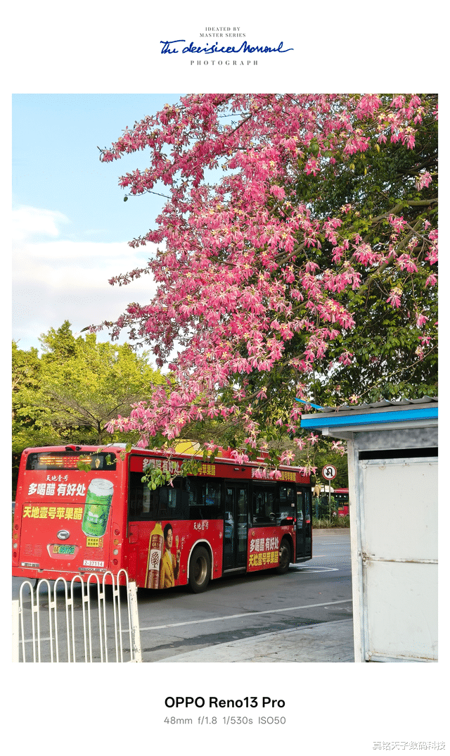 正常焦段的风景拍摄下,OPPO Reno13 Pro同样提供了非常足的清晰度,花朵的细节被清晰地记录下来,公交车上的文字也能清楚地看到,说明镜头的解析力很不错。更重要的是,OPPO对于色彩的调校也是趋向于真实,没有过分的拉高饱和度,清晰且自然的效果才是一款好手机的重要评判标准。