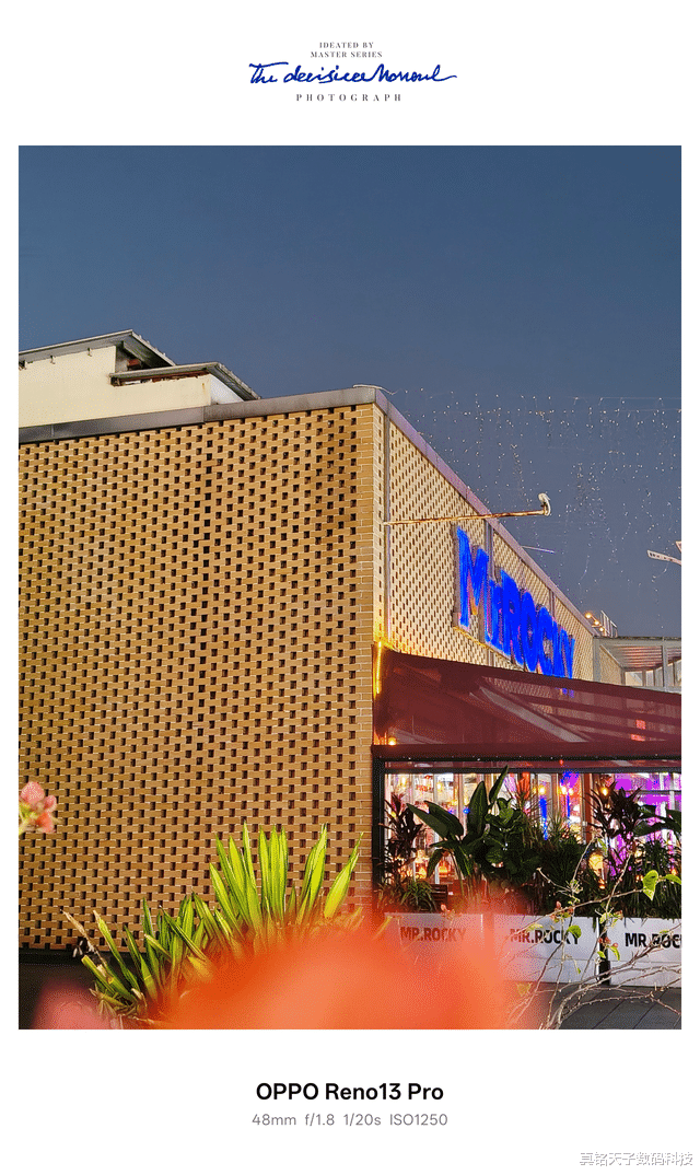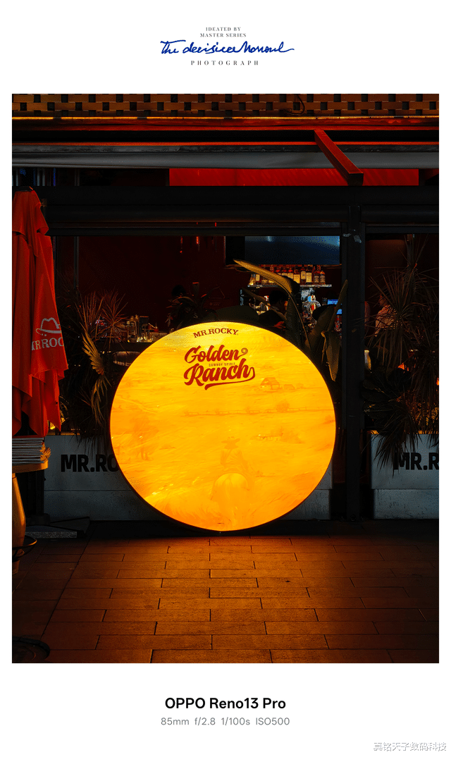 而在用长焦焦段拍摄夜景的时候,从效果上来看,OPPO Reno13 Pro对灯光氛围的出色捕捉能力非常出色。不仅圆形灯光招牌上的文字和图案都很清晰,而且招牌周围的环境也能很好地呈现在画面中。在这种光线复杂的场景下,Reno13 Pro 能够平衡高光和暗部,保留了足够的细节,展现出了优秀的动态范围,不愧是旗舰级的长焦镜头。