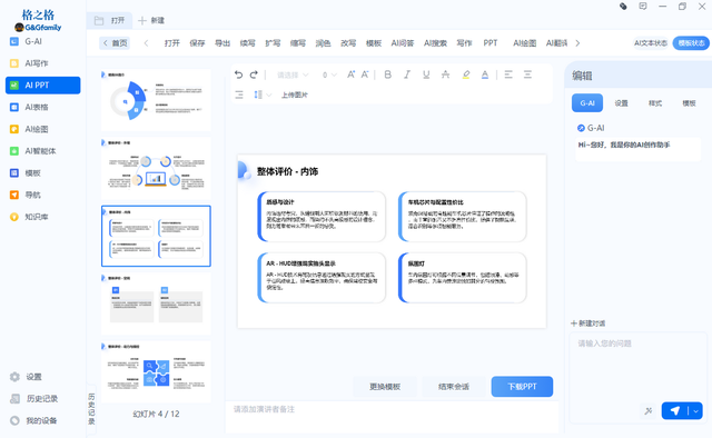 第四个功能也是我工作中刚好碰到的,由于我们工作需求,需要给客户设计一张演示厅渲染效果,刚好用这款格之格GK96 AI语音键盘进行AI绘图,里面有多种尺寸以及风格可以供选择,真的是大大的提高了我的工作效率,当然最重要是竟然还可以AI PPT: