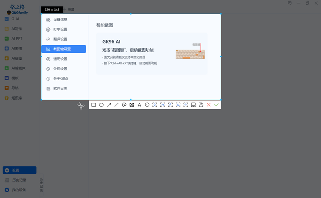 第二个惊喜就是,我们日常生活中经常用到的截图功能,之前一直在使用微信截图,但是有时候没有登录微信,就很不方便,除了截图集成功能以外,这款格之格GK96 AI语音键盘还集成了多种使用功能:翻译、、印刷体识别以及我最喜欢的手写体识别太方便了。