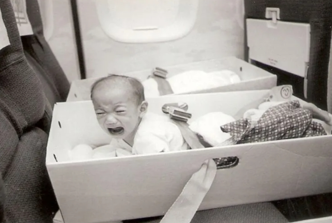从西贡空运出来的婴儿被放在文件箱里,绑在飞机座位上
