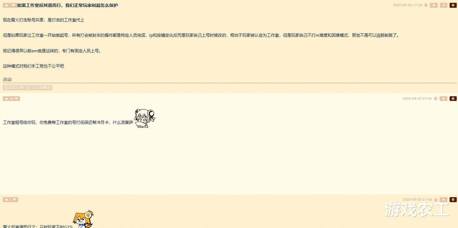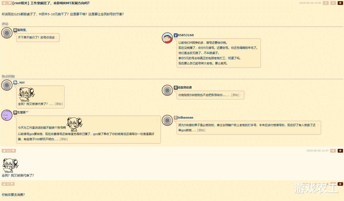 最近也有玩家表示说工作室是不是疯了,目前M团本的价格就5 - 10块钱,这个价格别的不说,至少工作室不可能回本,这简直就是一个“百亿补贴”的价格。并且该帖主表示是不是工作室想让全民封号。全民封号有点夸张,但是这个价格,工作室百分百不敢包赔,如果工作室这个价格敢包赔的话,那工作室真的是做慈善。不过也有一种可能是工作室想让大量玩家的账号被封,所以迫使雷火放弃封号。