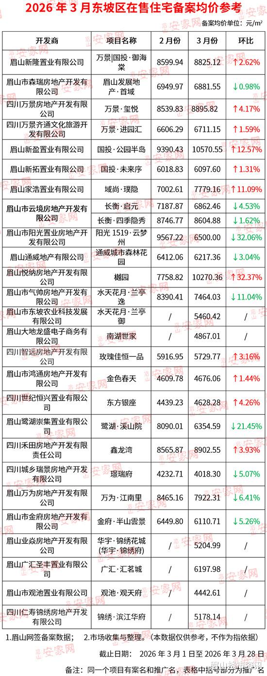 3月眉山(东坡区)商品住宅整体均价回落至7032元/㎡,虽略有下探,但仍稳守“7”字头。整体房价表面平静的背后,其实藏着各楼盘的“冷暖"不一。有的楼盘价格大幅高涨,有的则明显回调,还有些红盘稳定如常,背后的推动力是什么?各片区又呈现怎样的房价分布?接下来,让我们透过3月的备案房价,一探究竟。