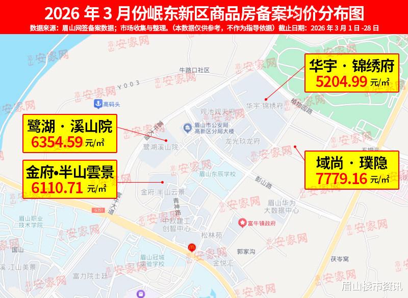 该片区房价在3月迎来普遍回落。鹭湖·溪山院(6355元/㎡) 从2月的8090元/㎡快速回调,域尚·璞隐(7779元/㎡) 因产品升级,房价迎来一波上涨。金府·半山雲景(6111元/㎡) 与华宇·锦绣府(5205元/㎡) 新增备案,后者价格明显低于往期常态。区域内部的价值重置仍在继续。