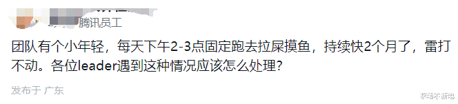 网上一个很下头的腾讯员工的leader在网上求助说:团队有个小年轻,每天下午2-3点固定跑去拉屎摸鱼,持续快2个月了,雷打不动。各位leader遇到这种情况应该怎么处理?