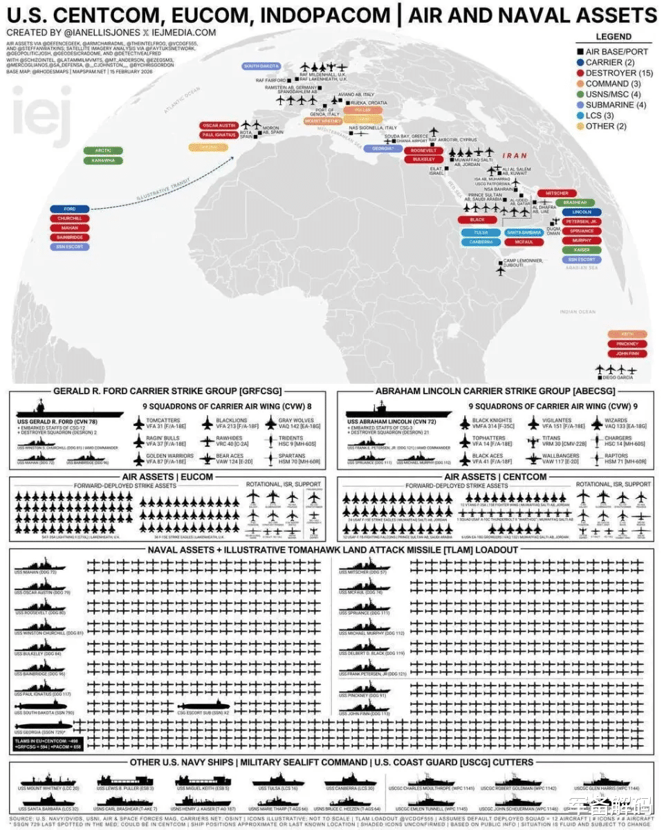 在海军维度,除了已在阿拉伯海游弋的“林肯号”(CVN-72)及其第9舰载机联队,美军最新王牌“福特号”(CVN-78)正从大西洋穿越直布罗陀海峡,预计一周内抵达战区;更值得注意的是,诺福克基地的“布什号”已进入预备状态,这意味着美国海军近三分之一的航母力量可能在短期内齐聚伊朗家门口。同时,水下配属了核动力攻击潜艇执行反舰与情报收集,水面则由3艘独立级濒海战斗舰在阿拉伯湾执行反水雷任务,甚至连海岸警卫队快艇都前沿部署至巴林,构成了严密的海上封锁态势,这种兵力密度已经可以对标2003年伊拉克战争。