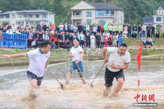 图为11月5日,江西宜春,木碾犁田项目中,选手在水田里拉木碾。刘力鑫 摄