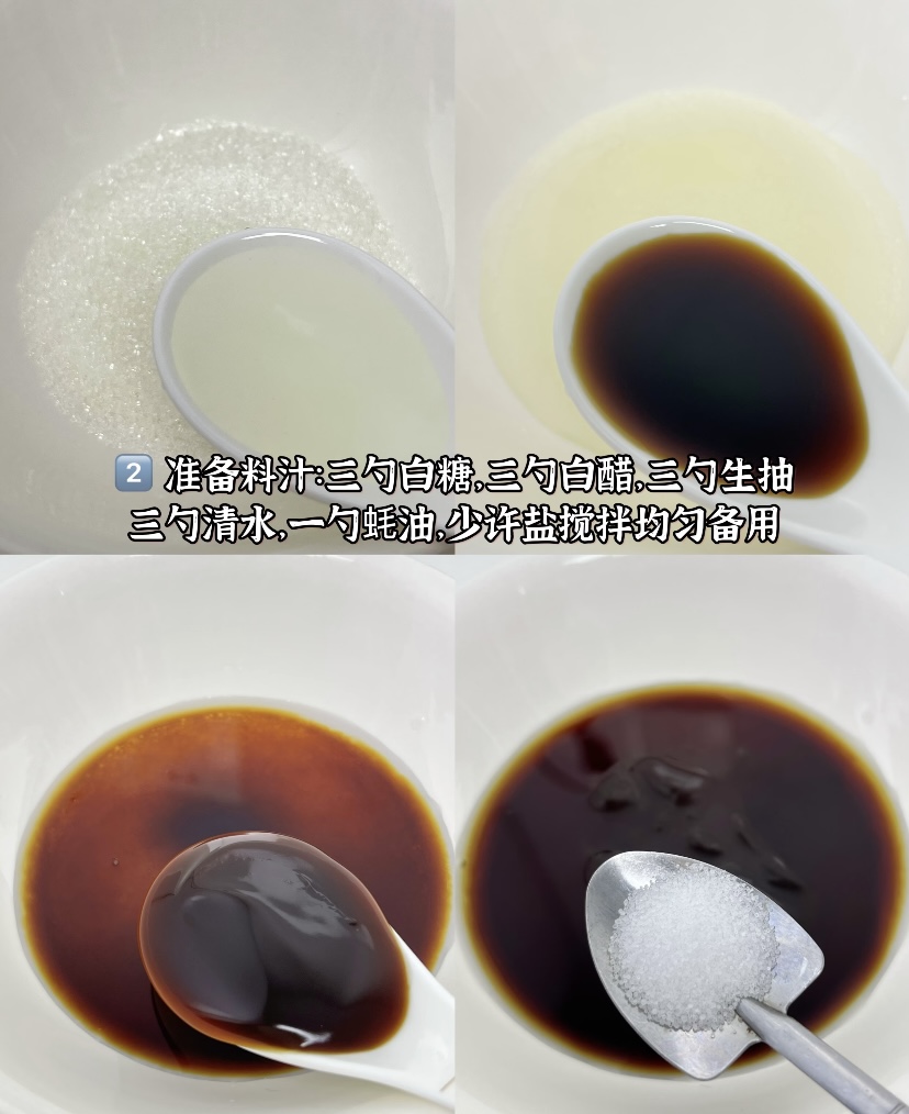 接下来是调制料汁,这是风味茄子的灵魂。在一个碗中,加入三勺白糖、三勺白醋、三勺生抽、三勺清水、一勺蚝油和少许盐,搅拌均匀备用。这个料汁的比例恰到好处,能够平衡酸甜口味,同时带出咸鲜和微辣的层次感。根据个人口味,可以适当调整糖和醋的用量,喜欢更甜或更酸的可以适当增减。