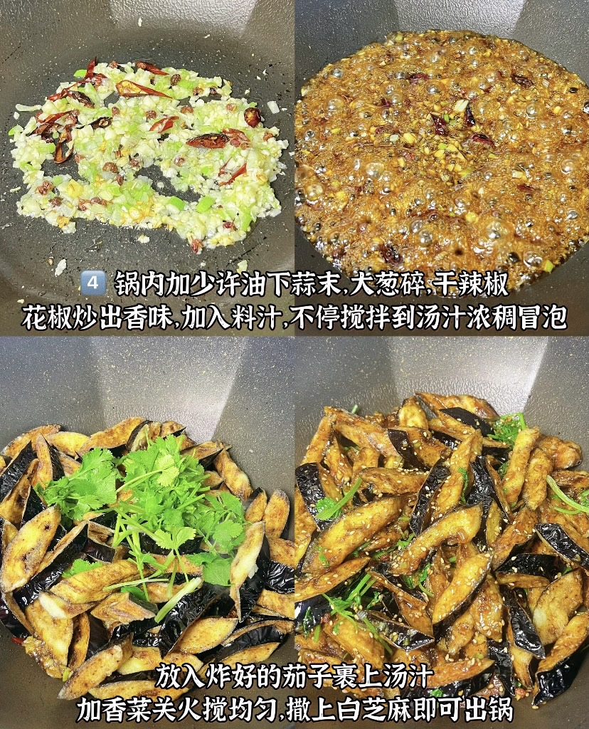 炸茄子的同时,可以准备调味的配料。锅内留少许底油,放入蒜末、大葱碎、干辣椒和花椒,小火炒出香味。注意火候不要太大,以免配料炒糊,影响口感和色泽。炒至香味四溢时,倒入之前调好的料汁,转大火快速翻炒,直到汤汁变得浓稠并开始冒泡,这一步能让料汁充分融合各种配料的香味,形成浓郁的调味汁。
