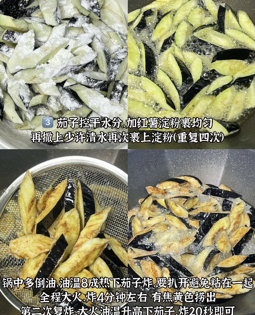 茄子的炸制是这道菜的关键步骤。将浸泡好的茄子捞出,控干水分,然后加入红薯淀粉裹均匀。这里有一个小技巧,可以撒上少许清水,再次裹上淀粉,重复四次,这样可以使茄子表面形成一层厚厚的酥脆外壳。锅中多倒一些油,油温烧至八成热时,将茄子逐个放入锅中,用大火炸制约4分钟,期间要用筷子或漏勺轻轻扒开,避免茄子粘在一起。炸至茄子表面呈焦黄色时捞出,沥干油分。为了使茄子更加酥脆,可以进行第二次复炸,大火将油温升高后,放入茄子快速炸20秒,然后捞出沥油,这样茄子的外壳会更加酥脆,不易回软。