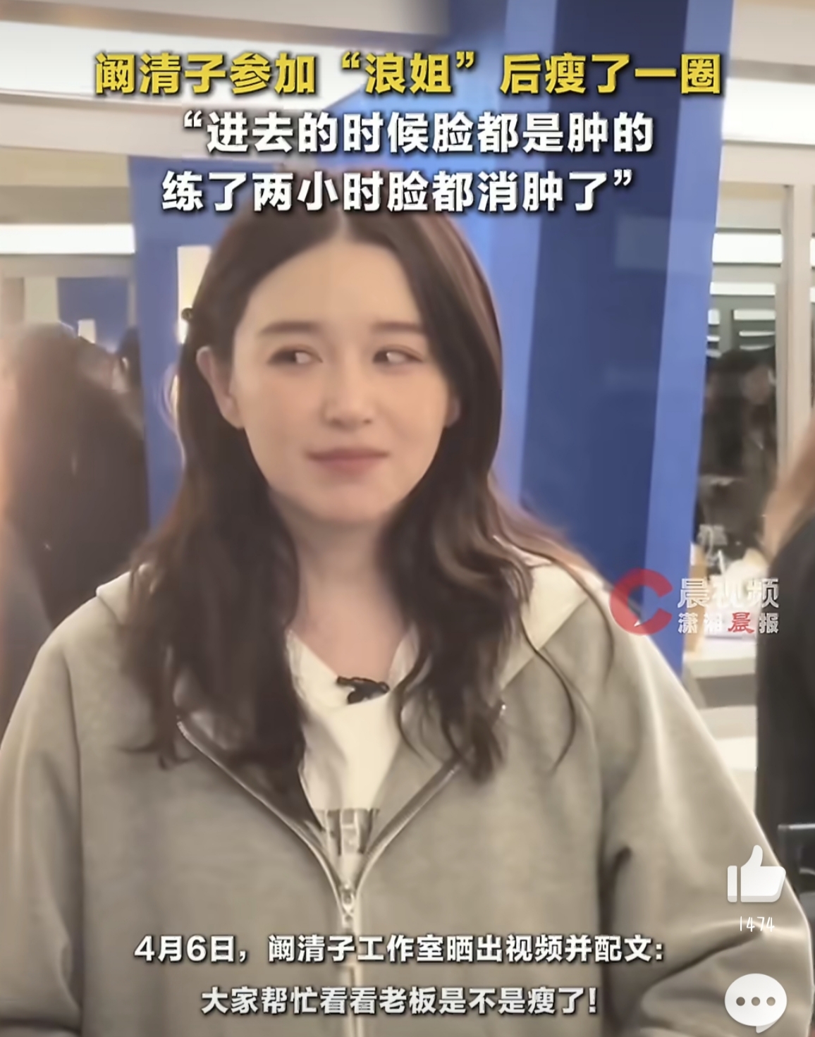 4月6日,阚清子工作室甩出一条视频,配文"大家帮忙看看老板是不是瘦了",直接冲上热搜。视频里阚清子本人亲自认证:"进去的时候脸都是肿的,练了两小时脸都消肿了。"好家伙,这效率比黑咖啡还猛,浪姐训练营怕不是偷偷改成了"消肿速成班"?