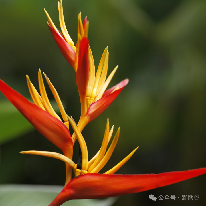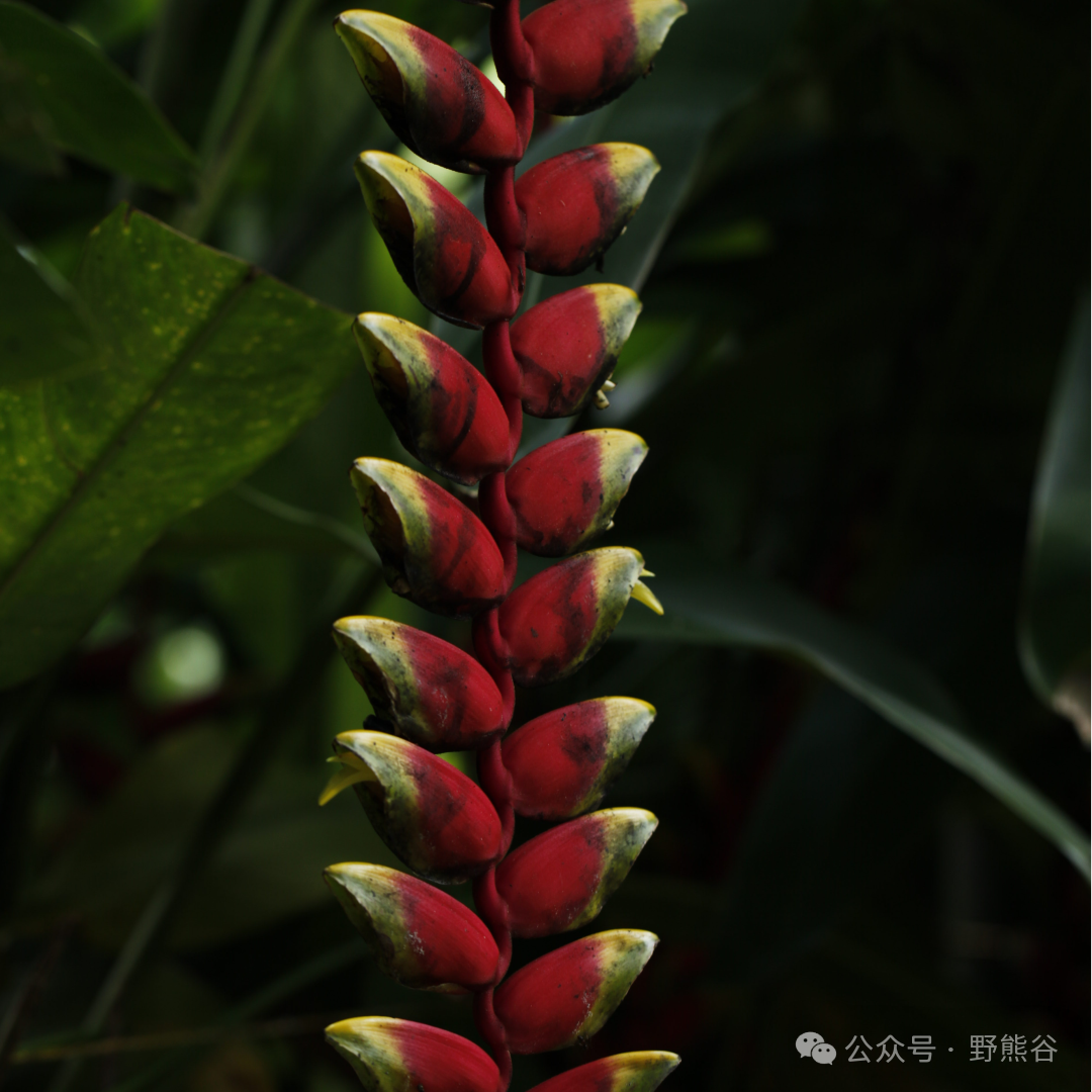 它的形态是“蝎尾蕉科”最经典的诠释。一串花序优雅下垂,金黄色的苞片如同鹦鹉弯弯的喙,边缘带着一丝鲜绿,尖端则带着一抹暗红,色泽层次极为丰富。从苞片中探出的,是细小的真花,如同雀鸟的舌。整体看去,它像一串精心设计的异域风情的吊灯,又像一群正在窃窃私语的金色鹦鹉,华美而别致。