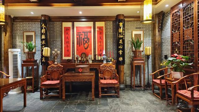走进楼中,装修古色古香。对联,字画,灯笼,酒旗,匾额,家具陈设,以及二楼走廊上记录家族历史的老照片墙,营造出浓厚的传统文化氛围感!