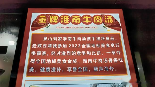 传说久远,已无从考证。只是这刘家淮南牛肉汤还在2023全国地标美食烹饪争霸赛中一举夺得了金奖,想必是御厨家传承下来的。