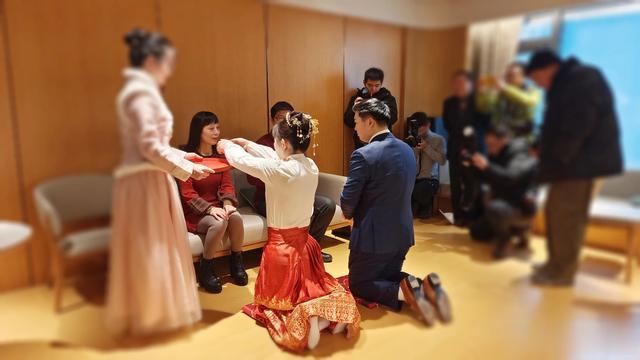 拜高堂改口敬茶,是中国传统婚礼中必不可少的一个过程。但现在不少年轻人觉得尴尬,便取消了这一环节。眼前一对新人倒是淳朴自然,情真意切。双膝跪地一杯茶,喊声爸妈成一家。