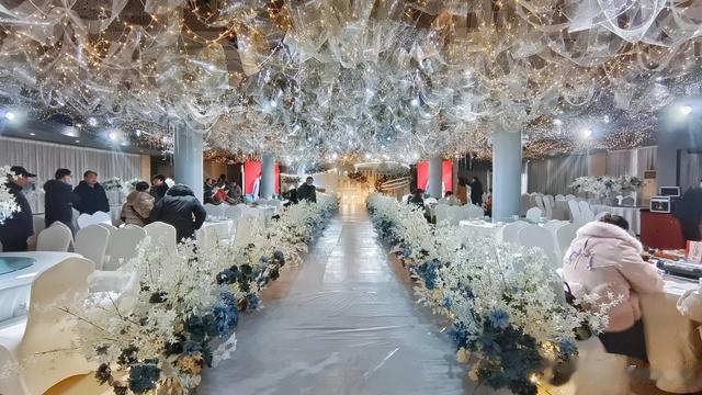 新娘已经换上洁白的婚纱,和新郎一起等在百合厅了。音乐,灯光,花束,淡蓝与白的主色调。浪漫,唯美。