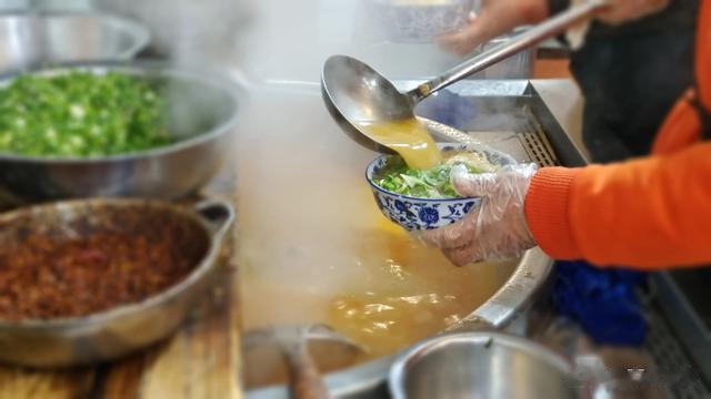 只见大师傅极其娴熟地流水作业。一碗一碗的食材配好,再从大锅里舀出一大瓢熬好的热汤,滋啦啦一个盖浇,顺手洒上葱花香菜,齐活!