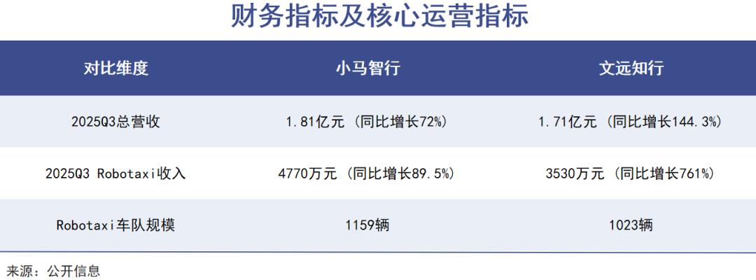 数据显示,2025年第三季度二者的Robotaxi业务收入分别是4770万、3530万,前者规模更大,而后者761%的同比增速更高;车队规模上,小马智行对外宣布,其Robotaxi运营车队规模已正式突破1159辆,而文远知行的这一数字为1023辆。