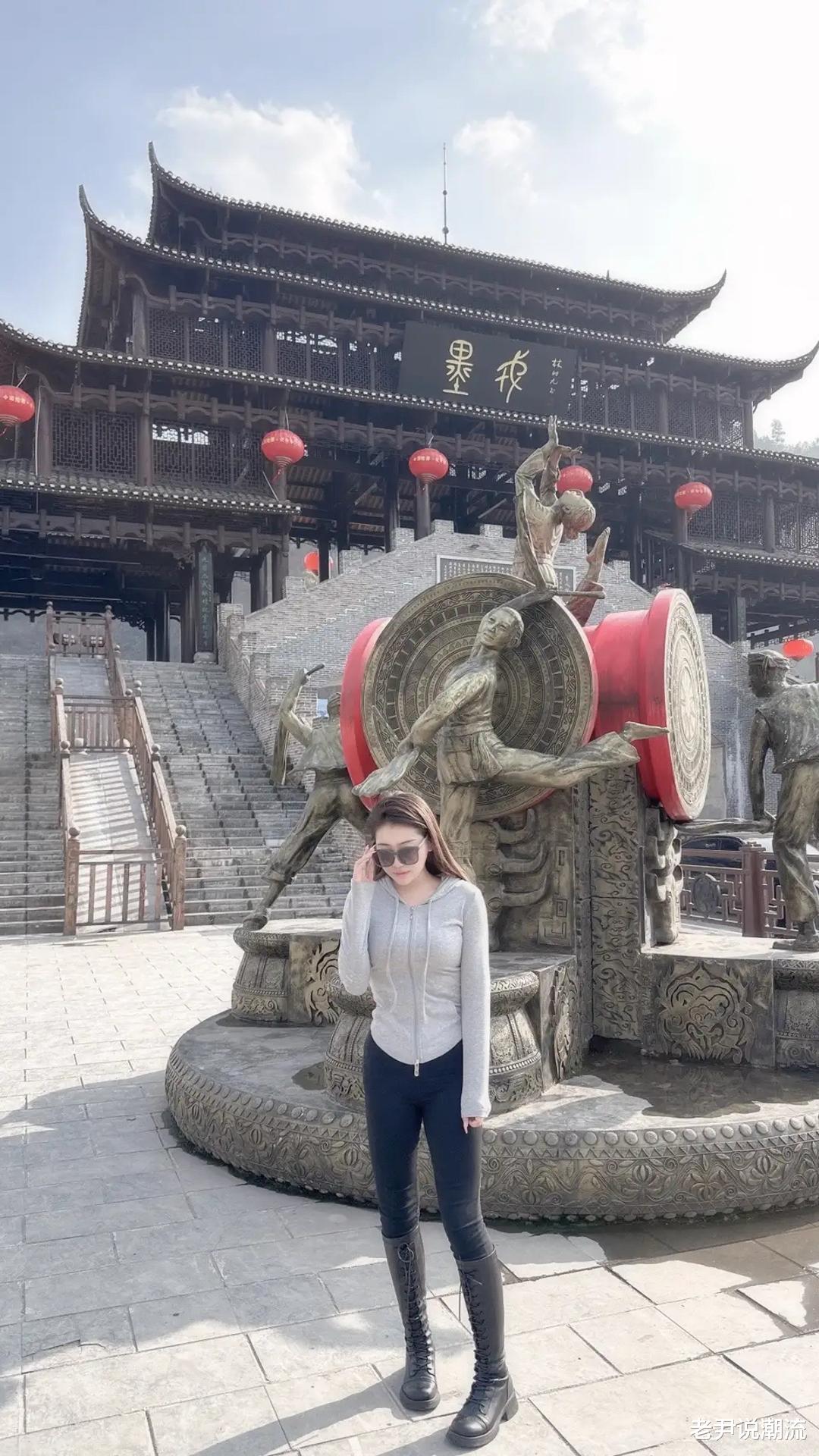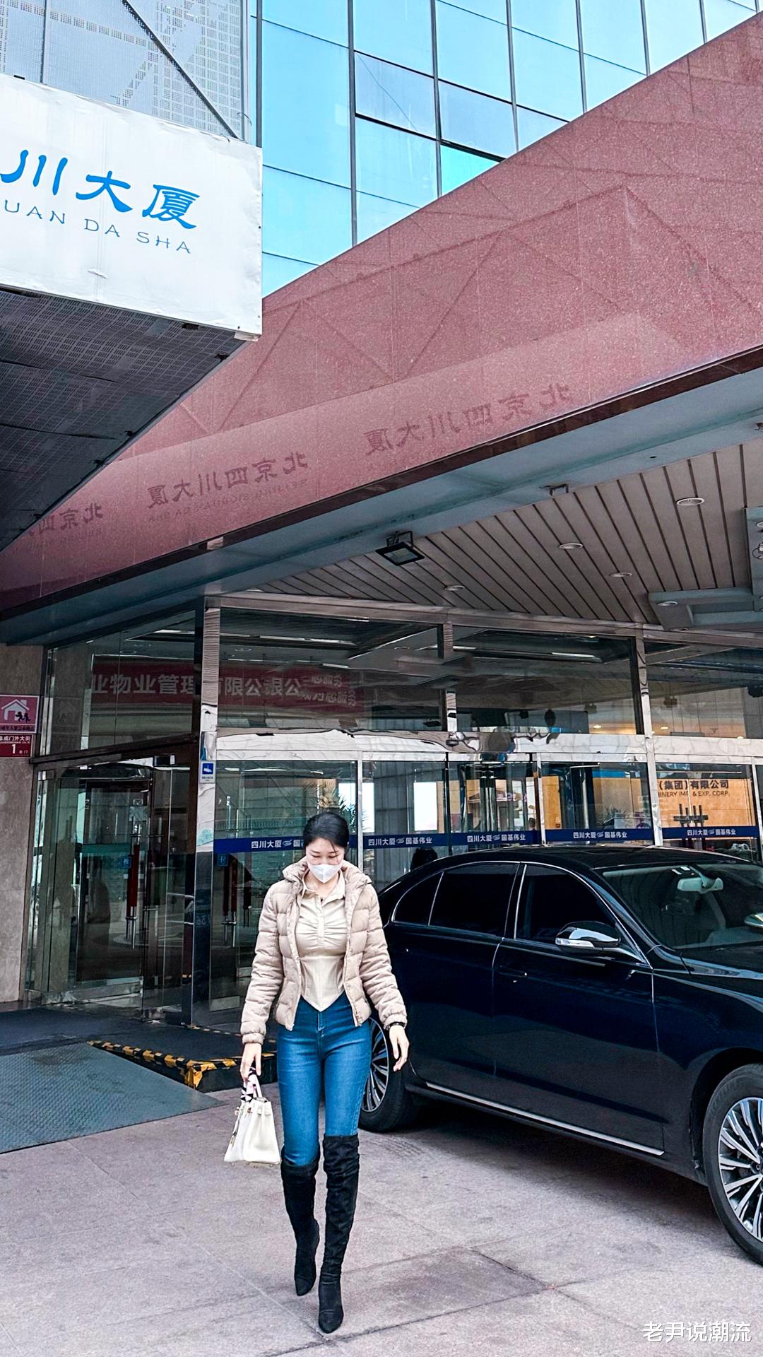 牛仔裤配长靴子,长腿美女无敌的长腿更显长,修身小衫同色系更百搭,风景中中间位置更出片。