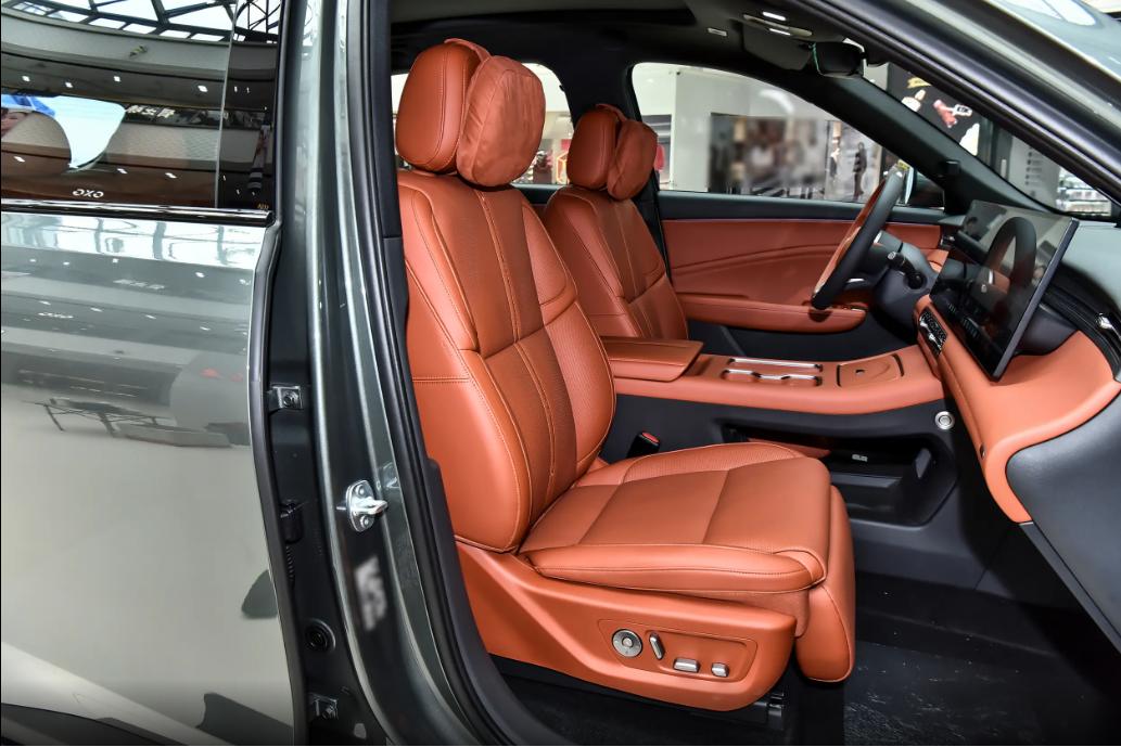 车内的座椅都是真皮的材质,符合人体工程学设计,可以贴合大部分人的身形,而且座椅包裹感很强,并且支撑力也不错,坐垫宽度足够,弹性十足,皮质材料耐脏容易打理。第一排的座椅支持电动调节,而且副驾驶这里有电动腿托,靠背调节的角度也很大,可以躺在这里休息,并且有按摩功能。这两个座椅还有记忆功能,至于加热和通风则是前后排都有。