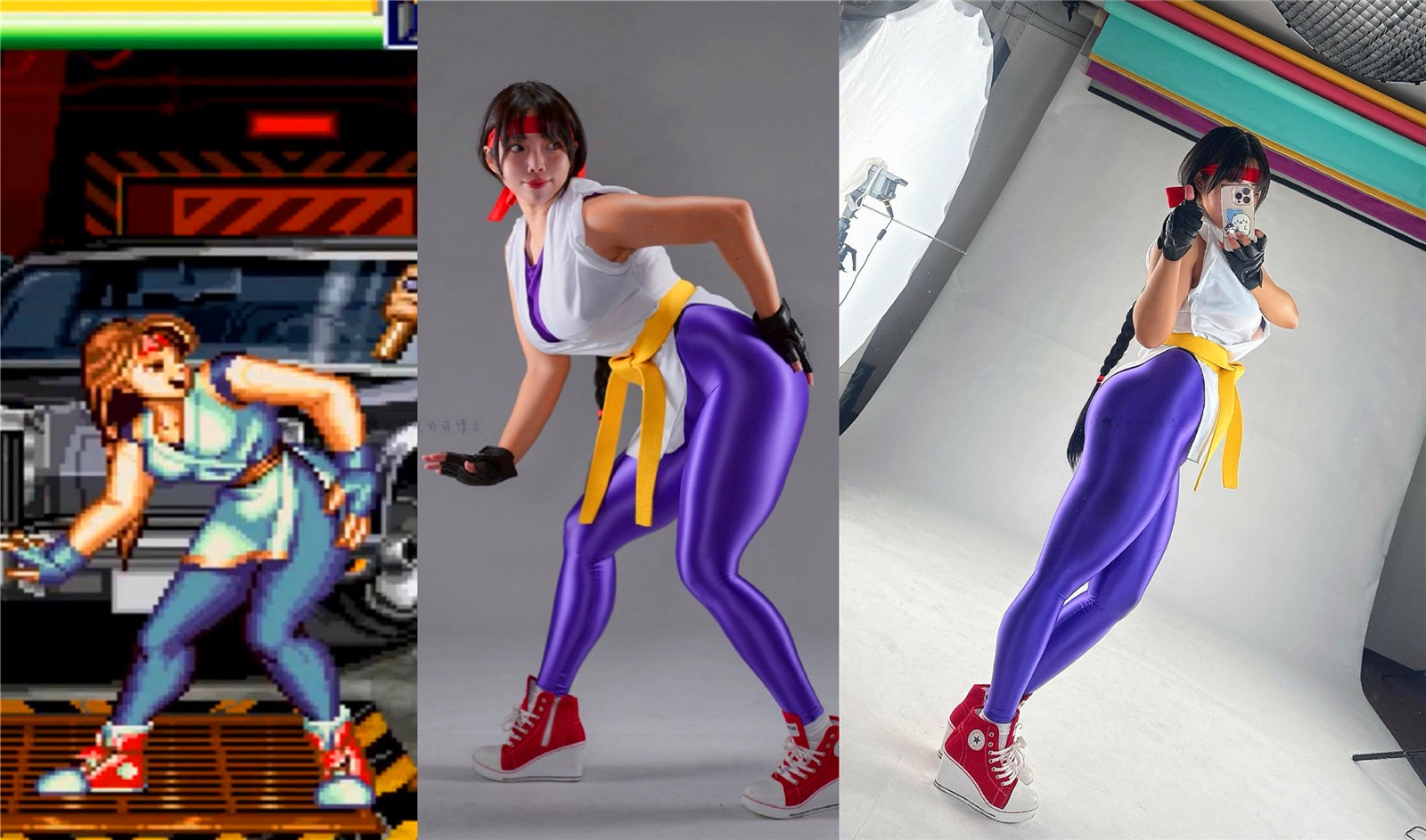 果然,她扮演的春丽迅速获得了大量玩家的认可!而只Cos春丽的话就把路走窄了,因为格斗游戏里有大量的人气女性角色,会打架的人物自然是健康壮实的,瘦弱的极少,这不就有了海量素材吗?后续博士留意到:她又扮演了《拳皇》(还有《龙虎之拳》系列)坂崎百合(Yuri Sakazaki),惟妙惟肖的模样同样得到了玩家们的青睐。