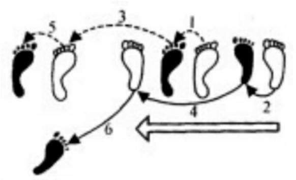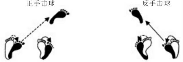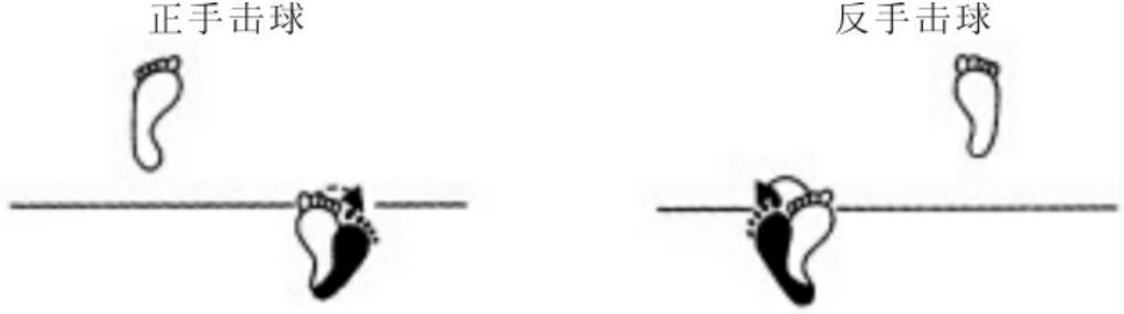 两脚分开站立,以右脚前掌为轴,左脚向来球的方向迈出一步,两脚的假想连线与来球的方向平行。