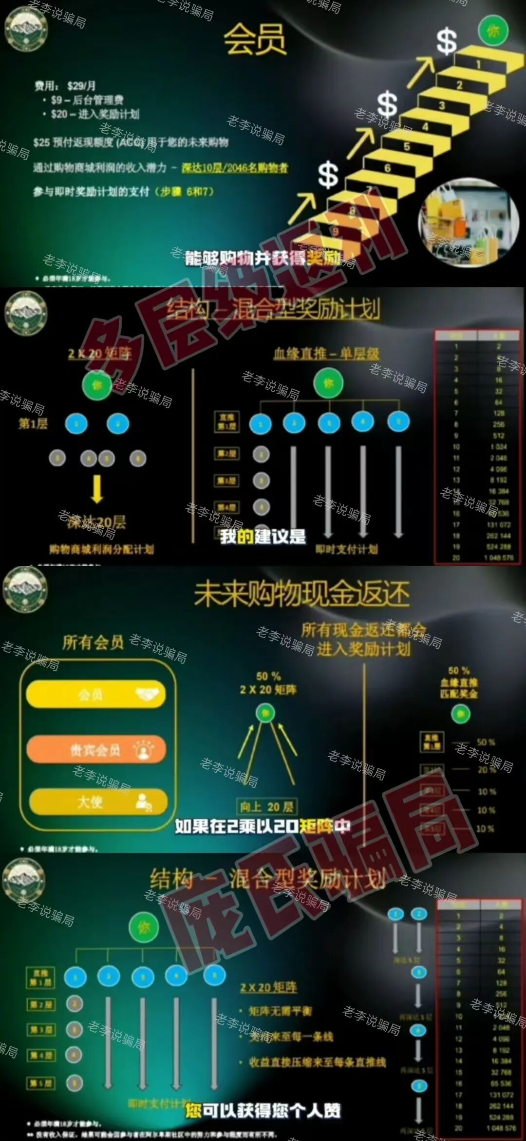 打着跨境电商旗号,实质核心为一款加密货币。要求用户缴纳129美元获得参与资格,通过“1-20层强制矩阵”和推荐关系形成金字塔层级,根据推荐人数发放见点奖。收益完全依赖新人入金,属典型庞氏骗局。