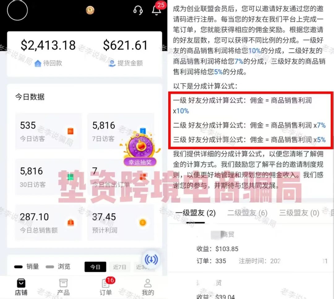 打着跨境电商旗号要求用户兑换美金垫资下单,号称由公司一件代发,7天后回款。推荐好友享三级分佣。