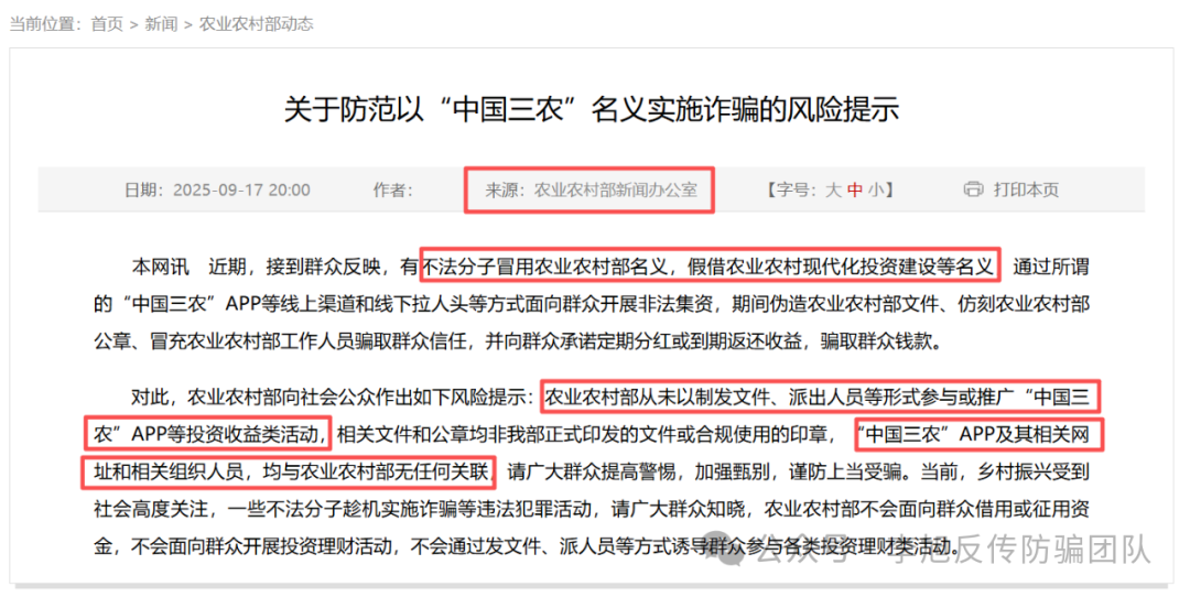 2025年9月,农村农业部官网对此发布《关于防范以“中国三农”名义实施诈骗的风险提示》