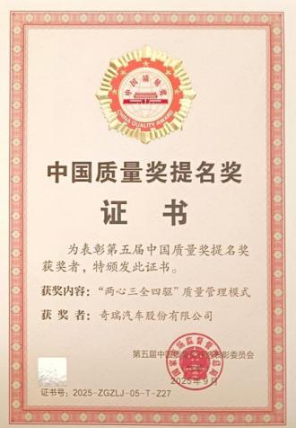 新能源销量的持续增长,得益于奇瑞将“可靠、耐用”的品质基因,持续注入新能源产品。奇瑞构建了覆盖电池安全、主动安全、碰撞安全与健康安全的新能源全域安全体系,并通过远超行业标准的严苛试验验证,确保电动化、智能化时代的可靠品质。2025年,奇瑞获得“中国质量奖提名奖”,旗下多款新能源产品获得全球各类五星安全评价。