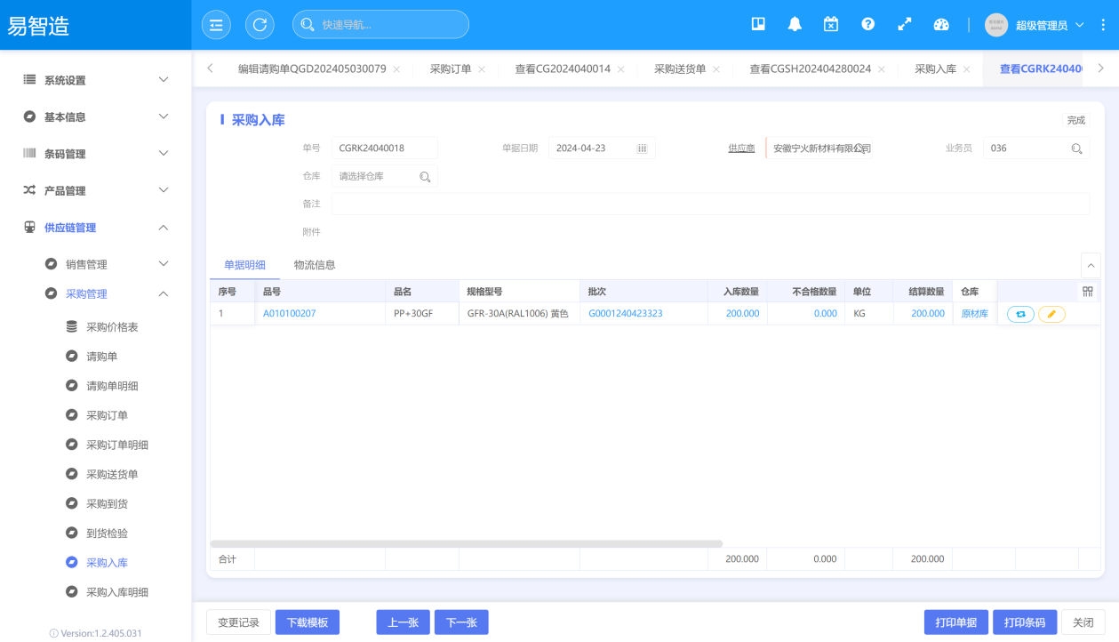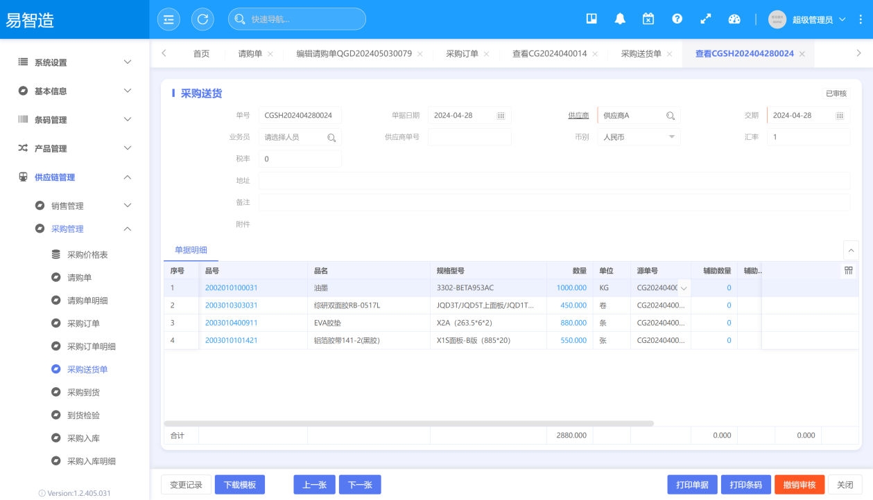 采购管理主要业务功能模块包括请购单、采购订单、送货通知单、采购入库单、退货