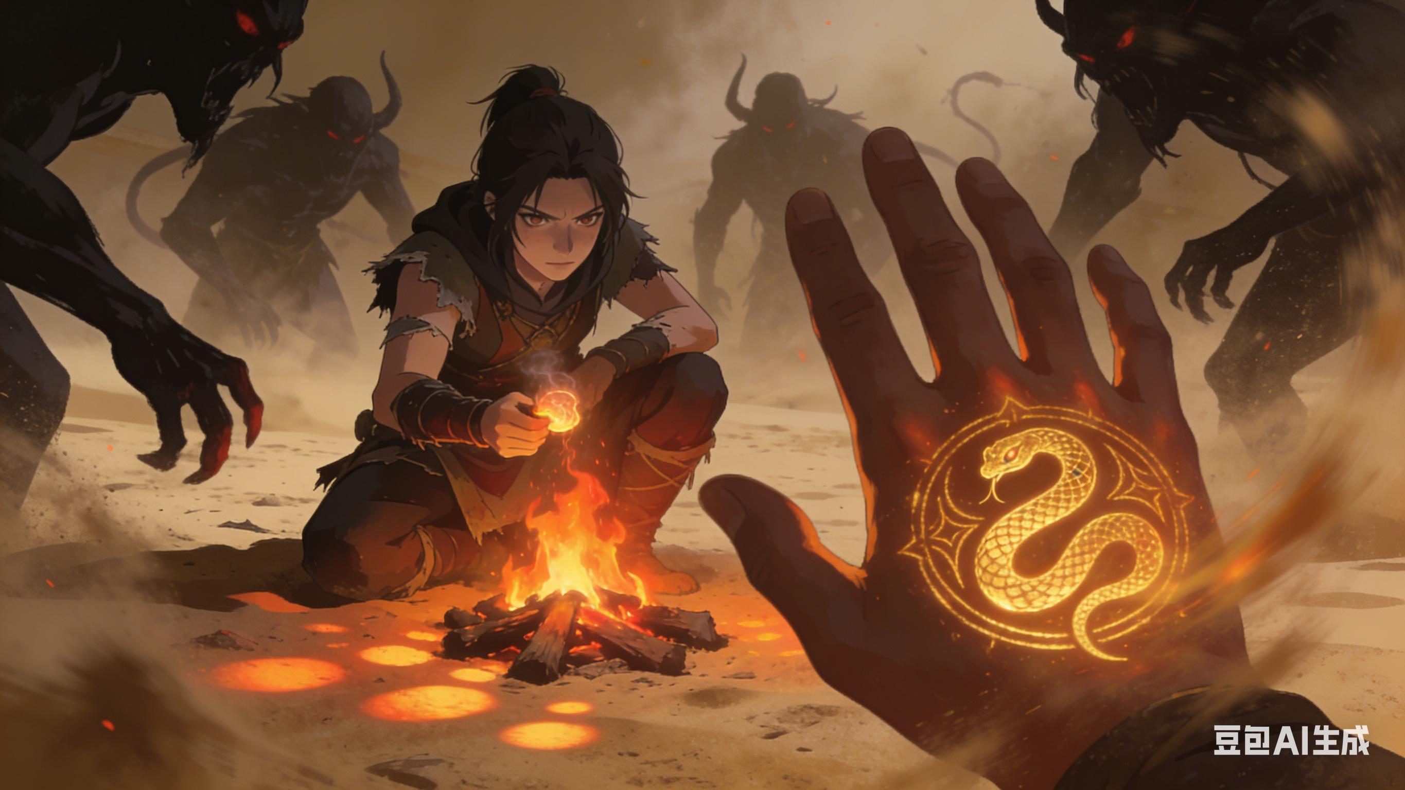 一次沙尘暴让希里安与努恩失联,他独自在荒野过夜,靠着魂髓篝火和武器与妖魔死战,掌心意外浮现熔金色衔尾蛇之印,助他躲过混沌侵蚀。