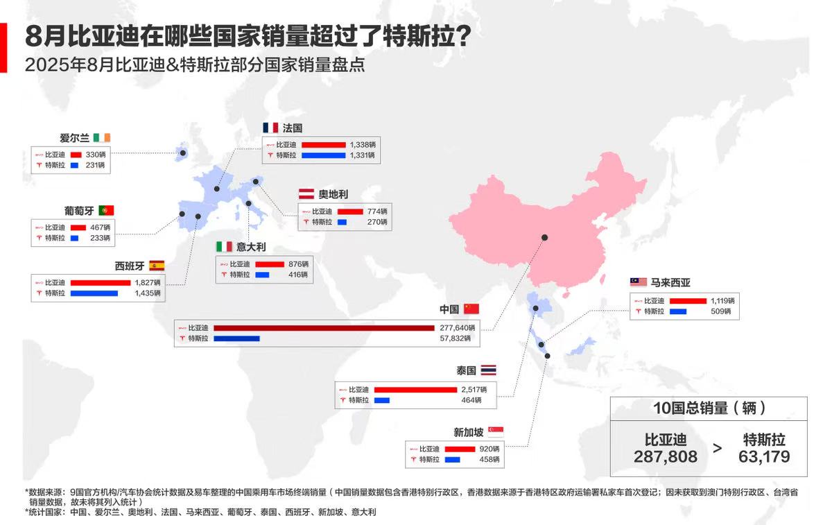 不光在国内能打,比亚迪在海外市场更是突飞猛进!今年 1-9 月,海外销量直接突破 70 万辆。就说 2025 年 8 月吧,不管是欧洲的西班牙、法国、意大利这些国家,还是东南亚的新加坡、泰国、马来西亚,比亚迪销量都超过了特斯拉,一路扩大领先优势,太给咱们中国品牌长脸了!