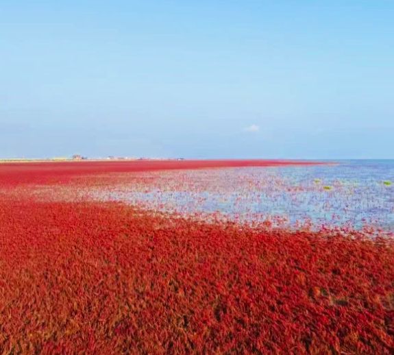 红海滩的诞生,是一次生命对严酷环境的静默告白。翅碱蓬是盐碱地的先锋植物,它无需人工播种,仅依靠海水的潮汐滋养,在滩涂上年复一年地生长、凋零、再生长。它的颜色随季节更迭而变化,春季嫩红,夏季转深,至九、十月间呈现最为绚烂夺目的红色。