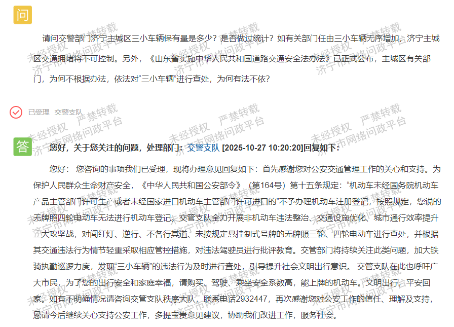 该网友指出,想了解济宁主城区“三小车辆”的保有量情况,询问交警部门是否做过相关统计。网友担忧,若有关部门放任“三小车辆”无序增加,济宁主城区的交通拥堵状况将难以控制。此外,网友提到《山东省实施中华人民共和国道路交通安全法办法》已正式公布,网友质疑主城区有关部门为何不依据该办法依法对“三小车辆”进行查处,是否存在有法不依的情况?