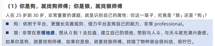 狼:喜欢从0到1建立领地,热衷竞争与风险,比如自建团队、制定规则。狗:擅长依附平台,完善规则,比如在大公司里发挥专业技能。自我评估:问问自己,你更喜欢“搏一搏”还是“稳一稳”?找对导师:如果你是“狼”,就找“狼师傅”;如果你是“狗”,就找“狗师傅”。