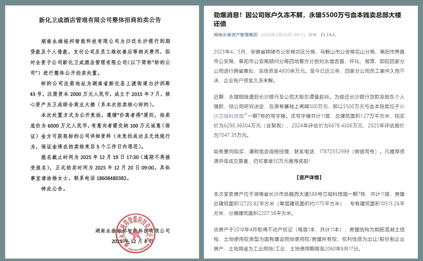 2025年底起,永雄集团在其官方公众号多次发布处置房产的信息,理由是为了支付员工工资和偿还长沙银行贷款。