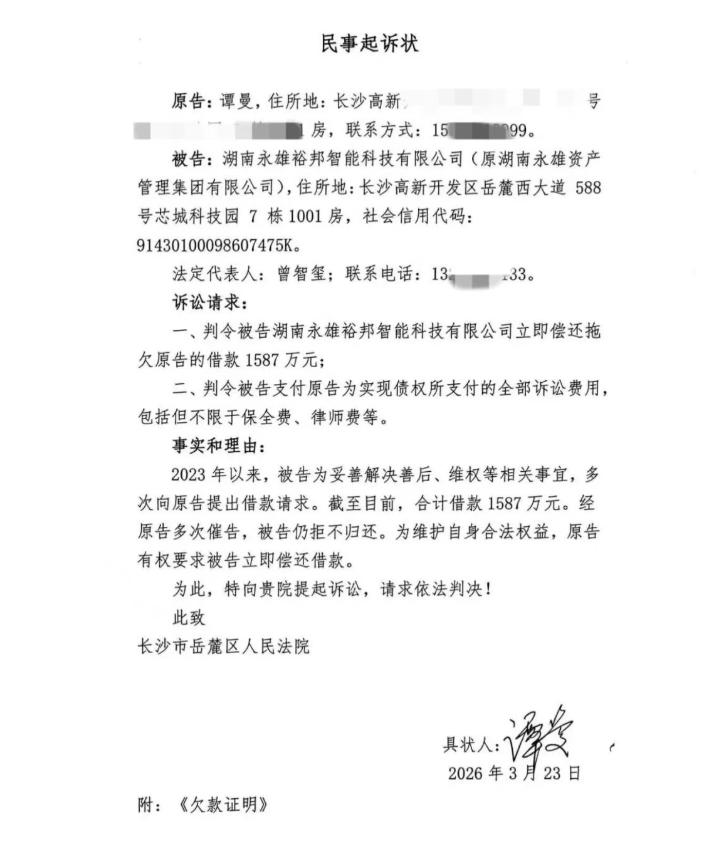 大股东追讨欠款1587万元,催收巨头或进入分钱阶段正常来说,长沙银行与永雄集团之间的纠葛已进入诉讼程序,接下来等着开庭判决就可以了,可一波未平,一波又起,大股东兼实际控制人谭曼也提交一纸诉讼,要求永雄集团支付欠款1587万元,其理由是起诉前一天永雄集团出具的一张欠条。