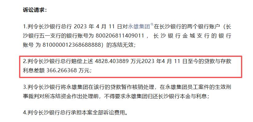 同时,永雄集团认为长沙银行冻结银行账户的行为违规,对长沙银行提起诉讼,要求赔偿4828万元及利息差366万元。据悉,该案于2026年3月26日开庭审理。