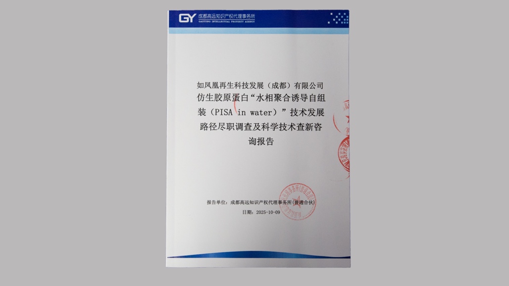据成都高远知识产权代理事务所专利代理人郑勇力博士评估,通过检索全球同类专利并比对技术方案,确认仿生胶原蛋白技术1.0为全球首创、国际领先;其2.0版本在“水相聚合诱导自组装(PISA in water)”工艺下进一步提升稳定性及自组装特性,并全球首次利用300 kV冷冻透射电镜捕获“胶原纤维束”超微结构,验证了多批次产品自主装形态特征的可重复性与一致性,同样具有“全球首创、国际领先”属性。
