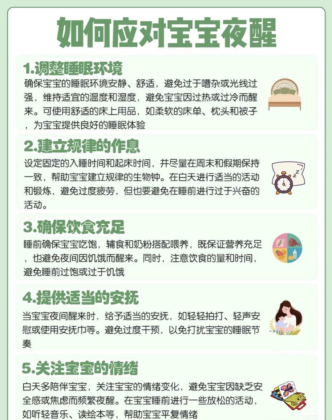另外,我们要学会区分宝宝的“真醒”和“假醒”。在睡眠周期的转换中,宝宝可能会哼唧、扭动甚至哭两声,这不一定是完全醒了。很多时候,他们只是在调整姿势,或者处于浅睡眠状态。这时,家长不要急着冲过去抱起来或喂奶,可以先观察几分钟,轻轻拍抚,给宝宝一个自己接觉的机会。如果一哭就抱,反而会打断他们的睡眠,让他们养成必须依赖大人安抚才能入睡的习惯。对于夜奶,随着宝宝月龄增长,如果生长发育正常,可以逐渐减少夜奶次数,用轻拍代替喂奶来安抚,帮助他们戒掉夜奶依赖。
