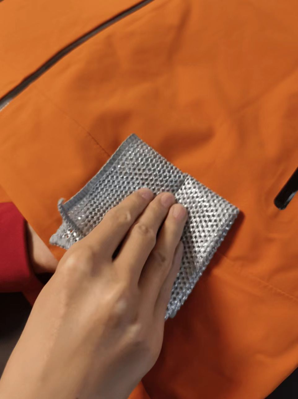 得益于SOPE-AIR涂层等黑科技的保护,VBREX冲锋衣实现了超常规5年性能抗衰减设计。用硬毛刷在冲锋衣面料的同一个部位反复摩擦了十来分钟,面料表面没有起毛、起球,也没有破损。对于经常进行重装登山、丛林穿越的户外爱好者来说,这样的耐磨性,足以让它成为一个可靠的“战袍”。