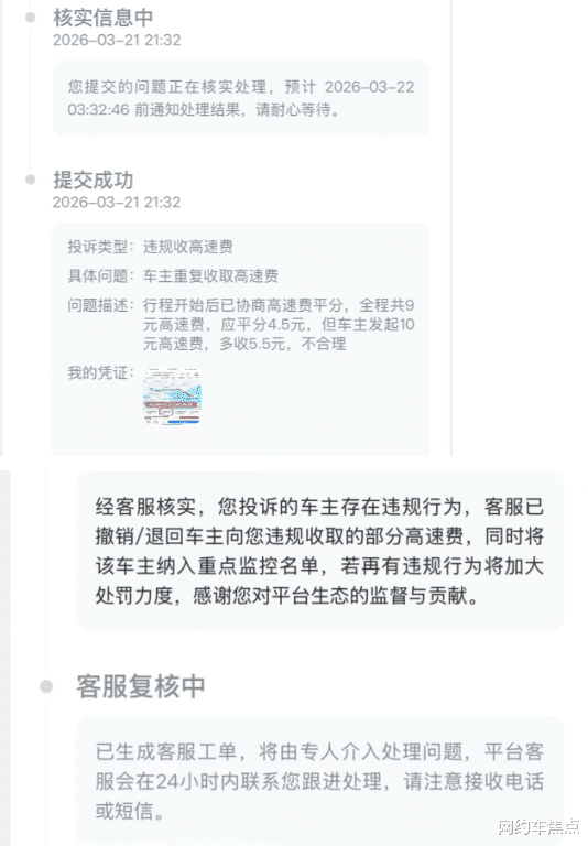 最后,乘客通常选择掏钱。司机心里或许还觉得多挣了几十块。然而第二天,平台发来通知:投诉成立,退回高速费,扣分降权、封号处理。
