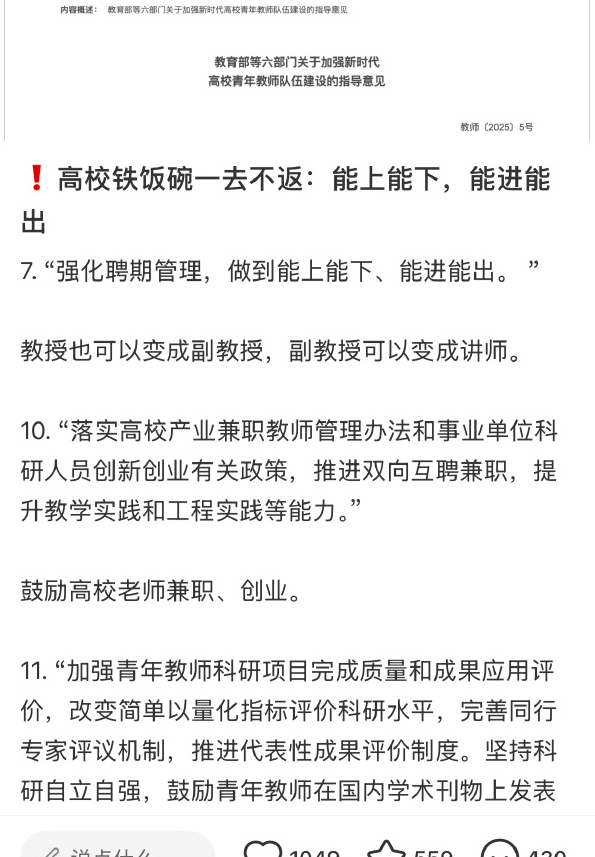 其实,“祛魅” 并非否定高校教职的价值,而是让更多青年学者看清其背后的竞争本质。无论是高校、企业还是其他行业,“躺平” 早已成为不切实际的幻想。对于青年教师而言,提前认清考核规则、慎重选择研究方向与团队、提升自身的科研与抗压能力,才是在学术道路上走得更远的关键;而对于高校来说,如何在严格考核与人文关怀之间找到平衡,避免过度 “唯成果论” 导致人才流失,或许也是未来需要思考的重要课题。毕竟,高等教育的发展,不仅需要 “发动机” 的强劲动力,更需要让每一位青年人才都能在合适的环境中发光发热。