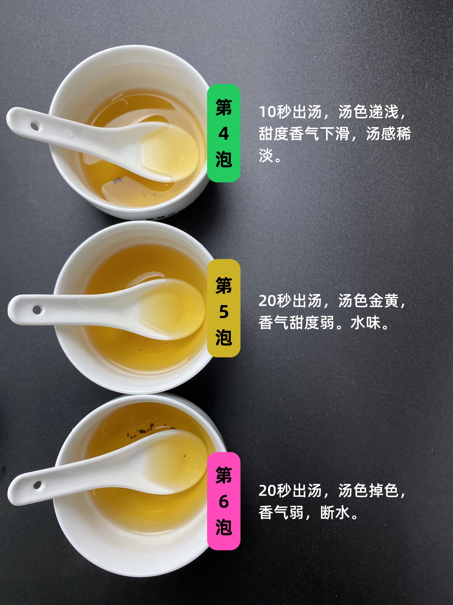 第三泡,10秒出汤,汤色比上一泡稍浅。奶香淡去。蜜甜。口腔干净,汤感饱满度减弱。