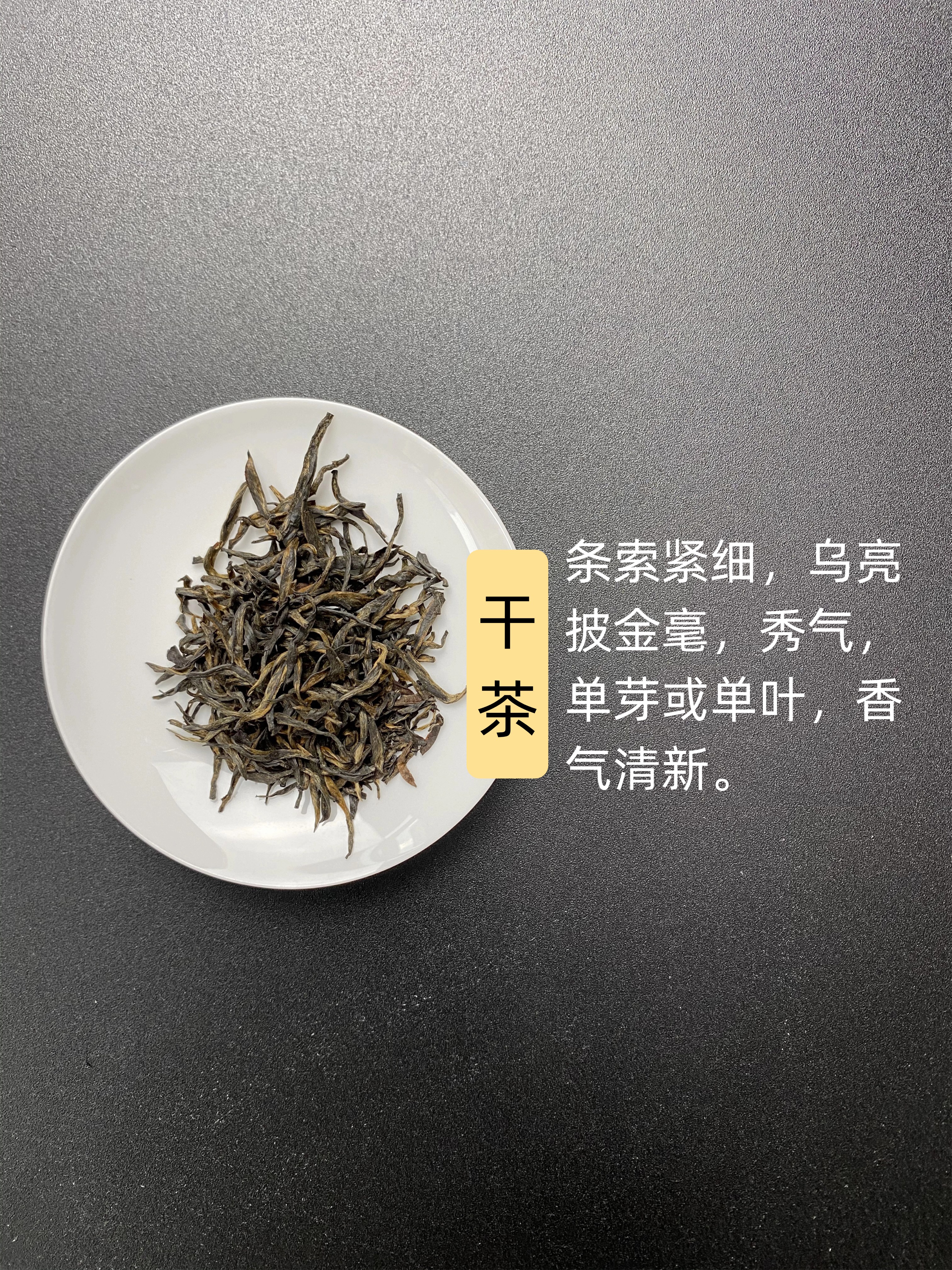 干茶,条索紧细,乌亮披金毫,秀气,单芽或单叶,香气清新。