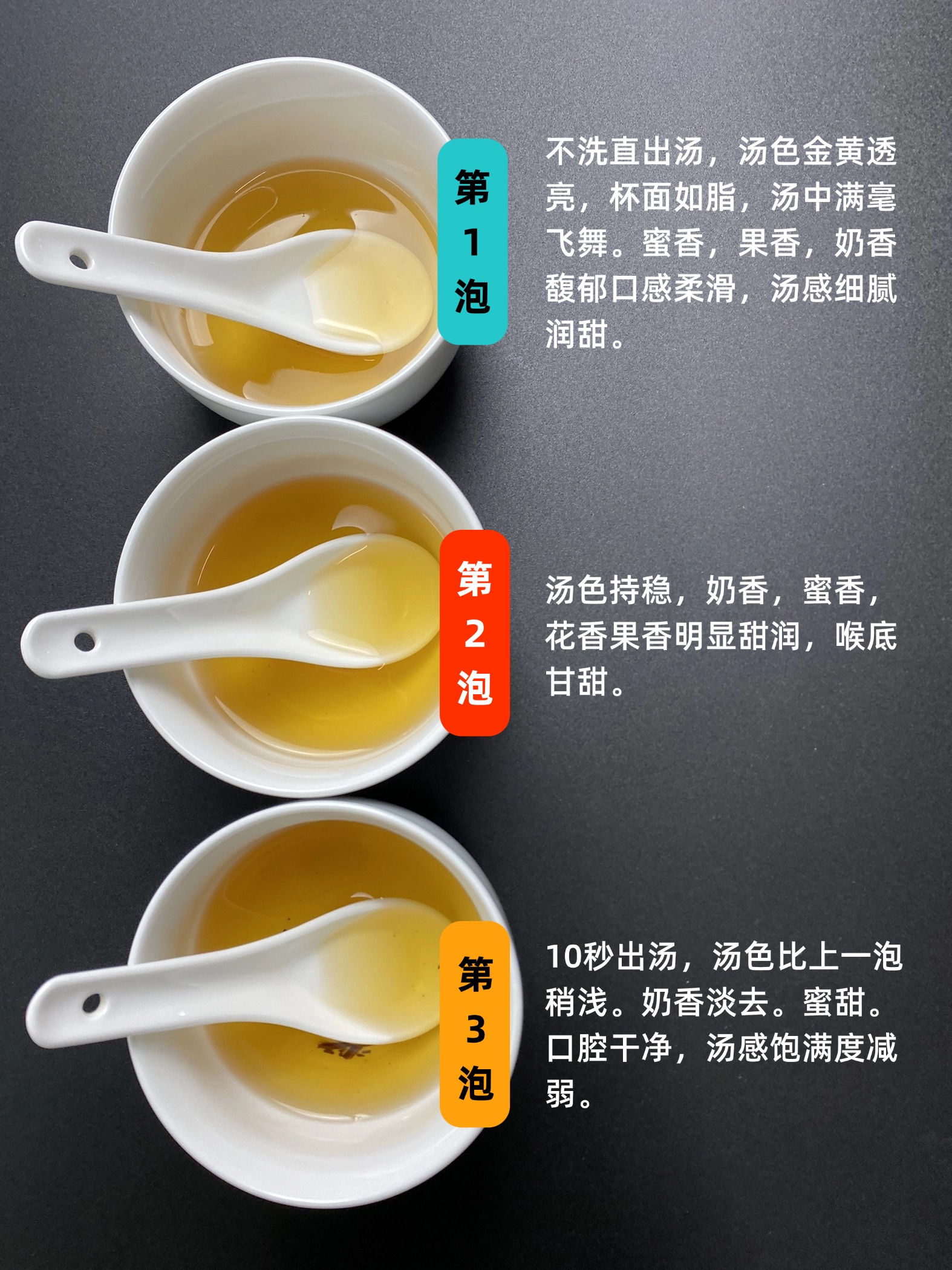 第一泡,不洗直出汤,汤色金黄透亮,杯面如脂,汤中满毫飞舞。蜜香,果香,奶香馥郁口感柔滑,汤感细腻润甜。