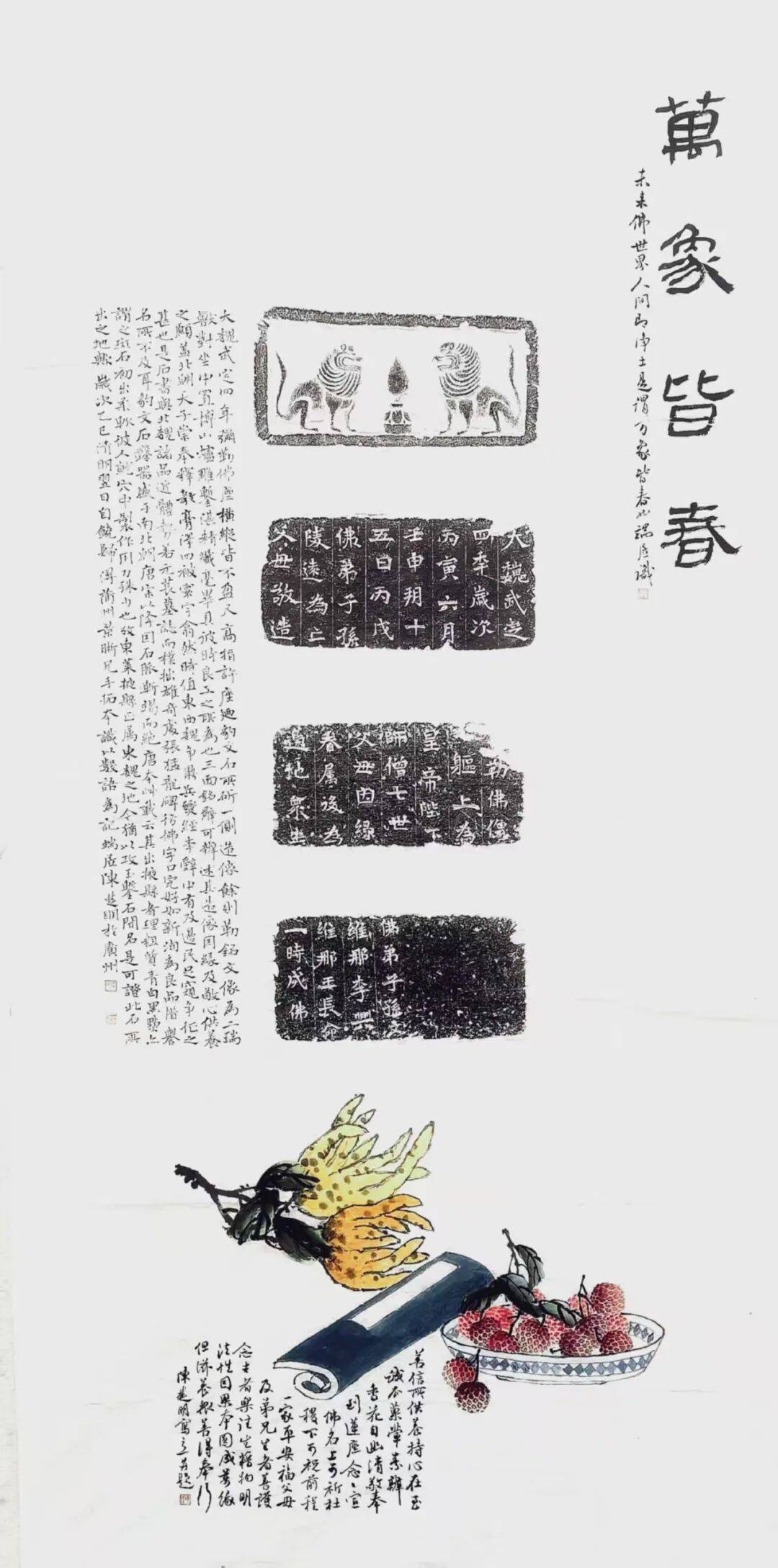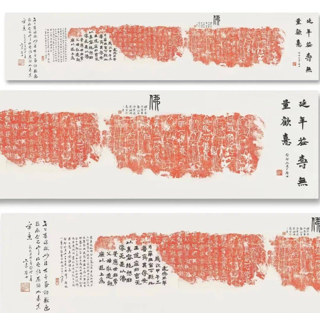 传拓之术,乃中华文脉存续之隐秘桥梁,以纸为媒,以椎为笔,以墨为魂,将金石沉厚、碑刻苍劲凝于一纸,使千年古意跨越时空、触手可及。景晰先生的传拓作品,便承载着这份技艺的厚重与匠心,恪守古法而暗藏修为。需特别申明,展陈诸作,拓片皆为先生亲手拓制,其间题跋题画,皆为同道艺术家挥毫补缀,主次分明、互为映衬,更添雅趣。